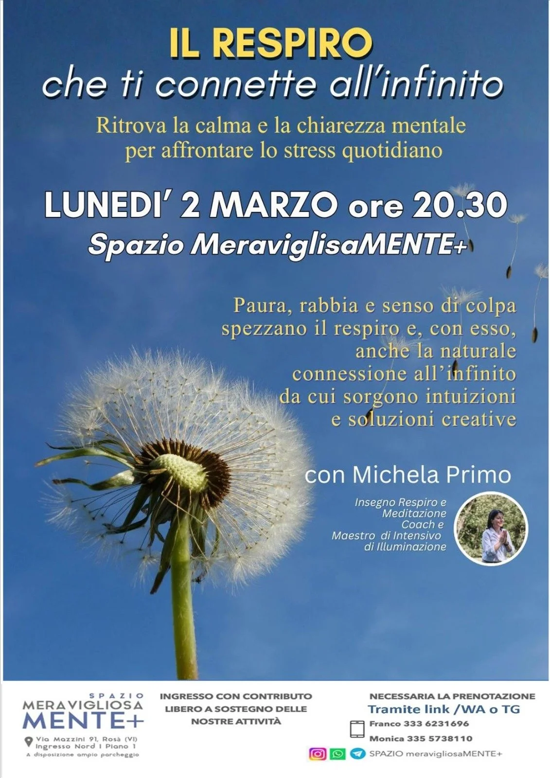 Il respiro è il ponte per raggiungere una dimensione di armonia ed equilibrio di corpo, mente ed emozioni. La consapevolezza del respiro è un viaggio, un tuffo dentro sé stessi che fa emergere chi-sei-tu e fa crescere l’abilità di rimanere centrati e presenti e, quindi più pronti a risolvere problemi e prendere decisioni anche in situazioni di grande tensione e stress.